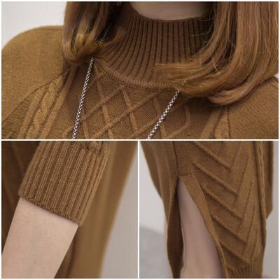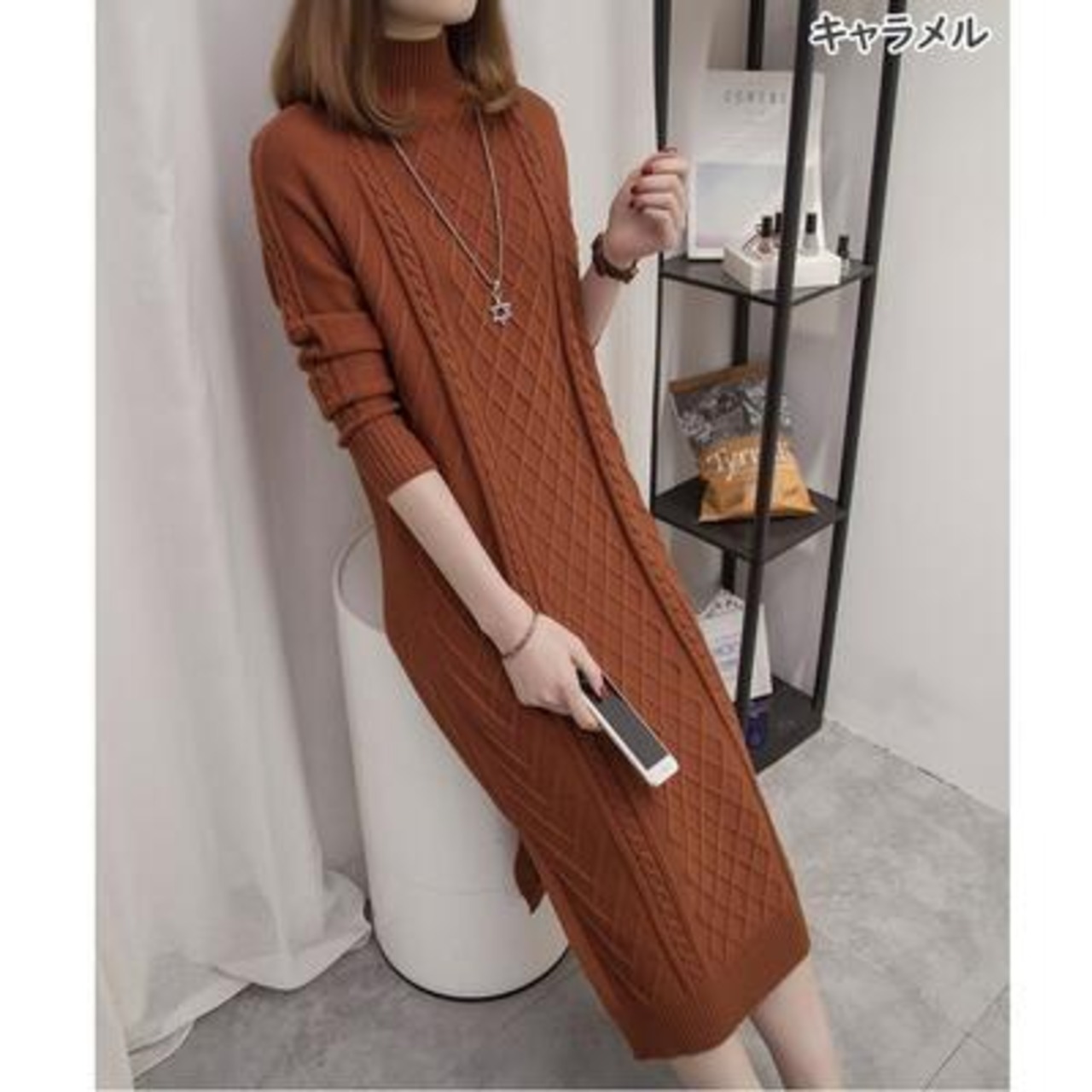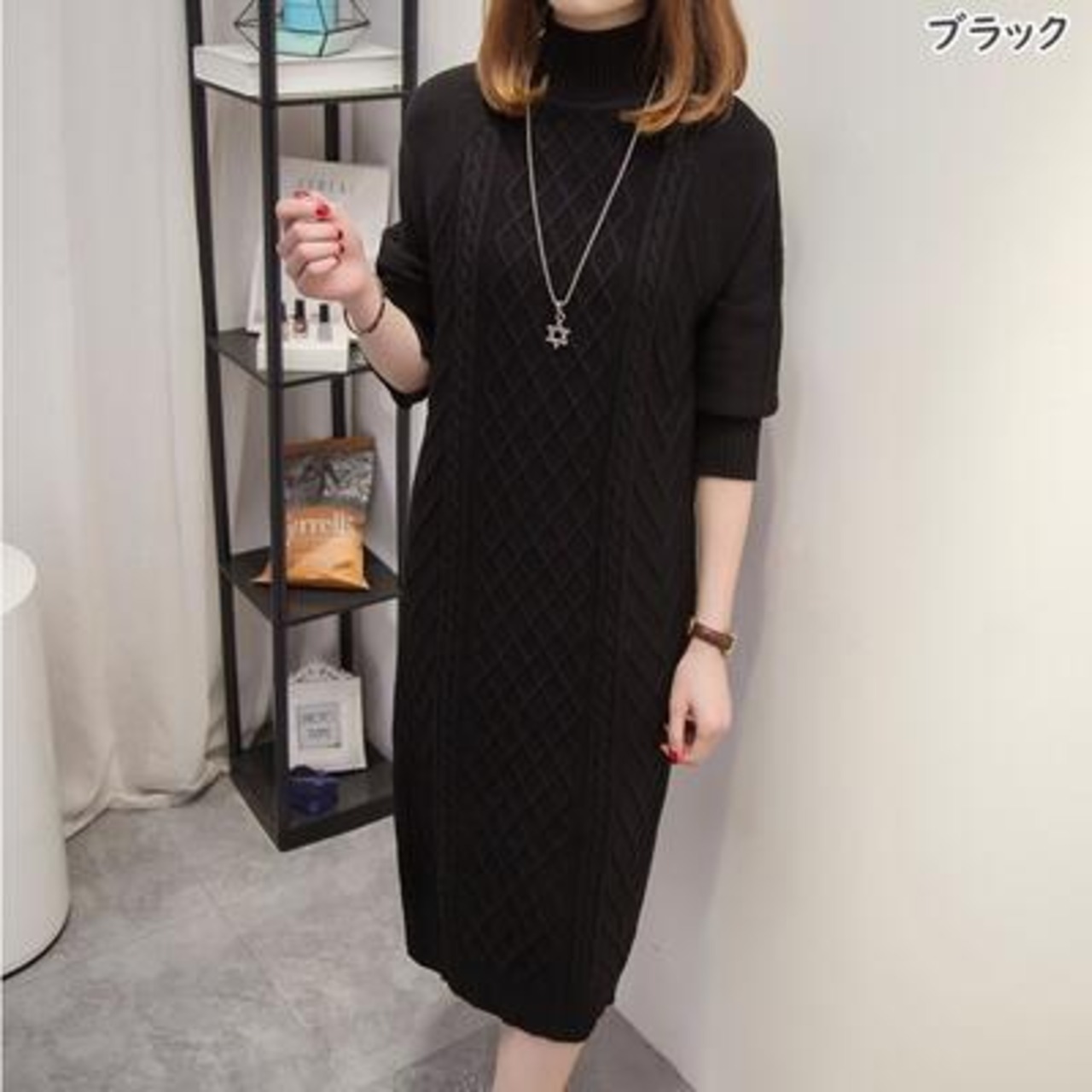 ハイネックのケーブル編みニットワンピース。