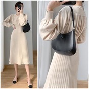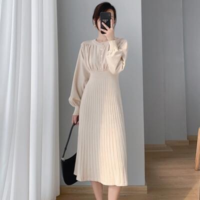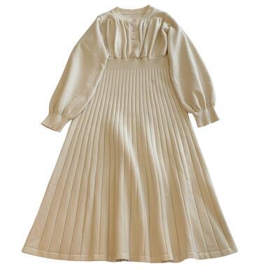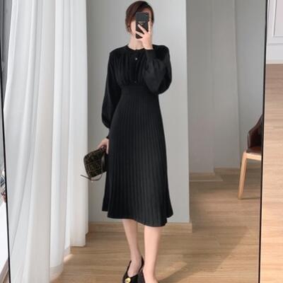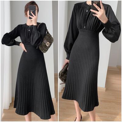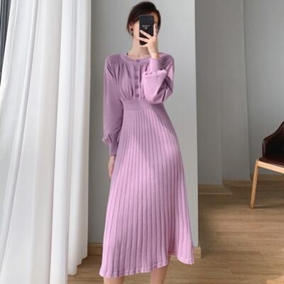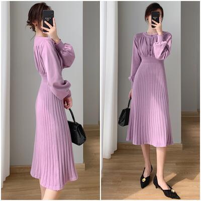 全3色 ニット ワンピース パフスリーブ エレガント 切り替え きれいめ カジュアル ミモレ丈 おしゃれ レディース ワンピ ドレス 長袖 フェミニン シンプル ハイウエスト パープル ブラック 黒 ベージュ 春 秋 冬 20代 30代 40代 50代