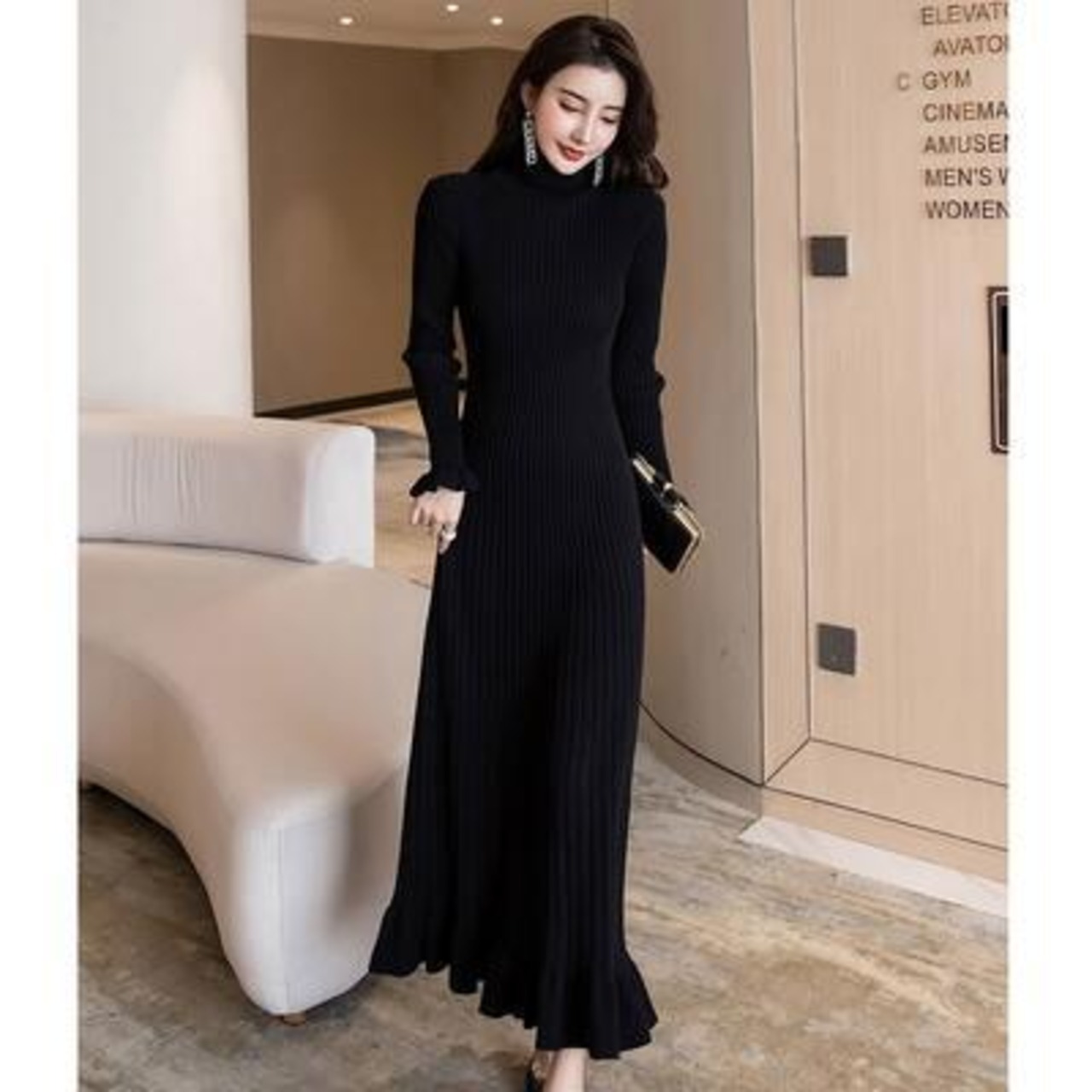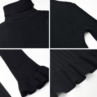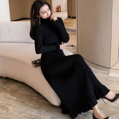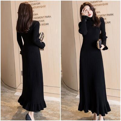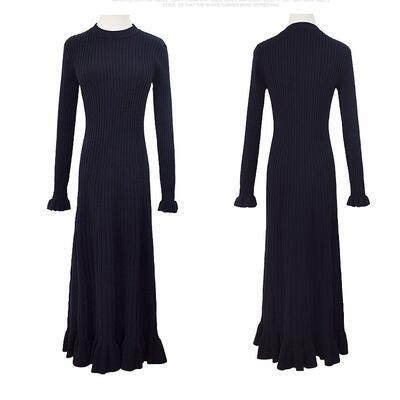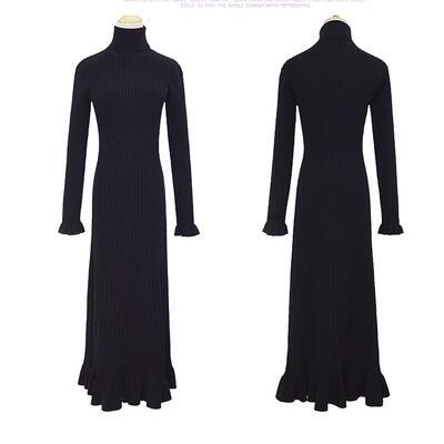 全2種 ニット ワンピース リブ ロングワンピ きれいめ カジュアル マキシ丈 長袖 タートルネック ラウンドネック フリル おしゃれ レディース ワンピ ドレス フェミニン エレガント タイト スリム 大きいサイズ ブラック 黒 春 秋 冬 20代 30代 40代 50代