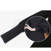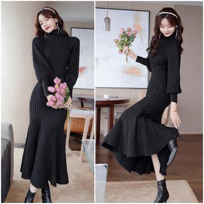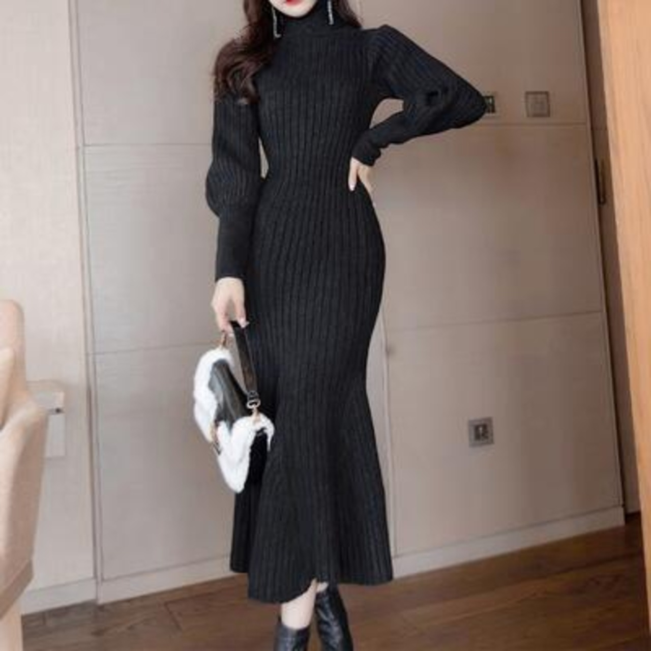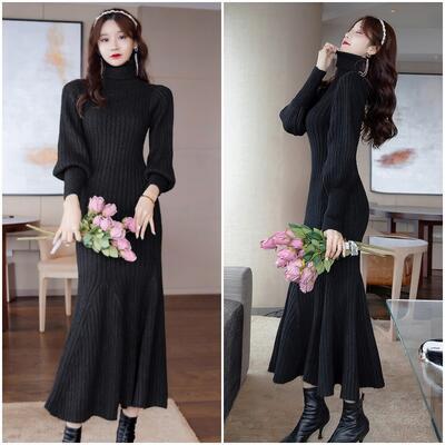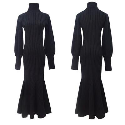 大きいサイズ エレガント ウール混 ニット ワンピース リブ ロングワンピ マーメイドシルエット きれいめ カジュアル ロング丈 長袖 タートルネック パフスリーブ フリル おしゃれ レディース ワンピ ドレス フェミニン タイト ブラック 黒 春 秋 冬 20代 30代 40代 50代