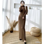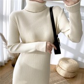 すっきりしたIラインシルエットのタートルニットワンピース。