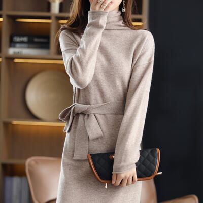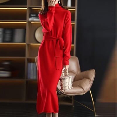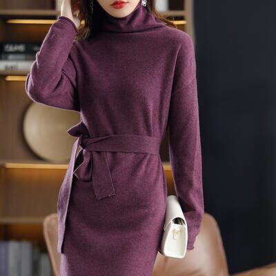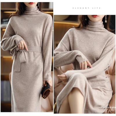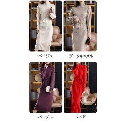 全4色 大きいサイズ ウール100% ニット ワンピース ロングワンピ きれいめ カジュアル ミモレ丈 長袖 タートルネック おしゃれ レディース ワンピ ドレス フェミニン エレガント ハイネック ベージュ ブラウン パープル レッド 赤 春 秋 冬 20代 30代 40代 50代