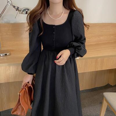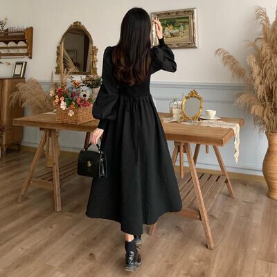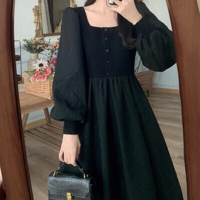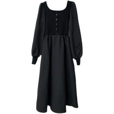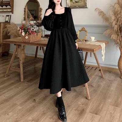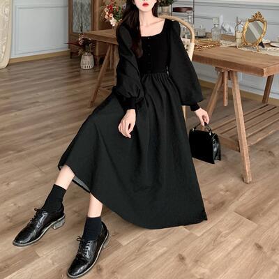 ワンピース ロングワンピ きれいめ カジュアル ミモレ丈 パフスリーブ 長袖 異素材ミックス 切り替え おしゃれ レディース ワンピ ドレス フェミニン スクエアネック クラシカル ハイウエスト 可愛い ゴシック ブラック 黒 春 秋 冬 20代 30代 40代 50代