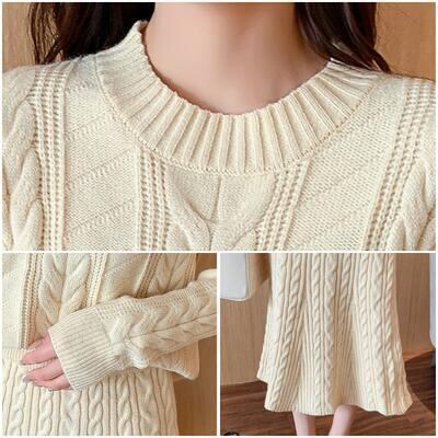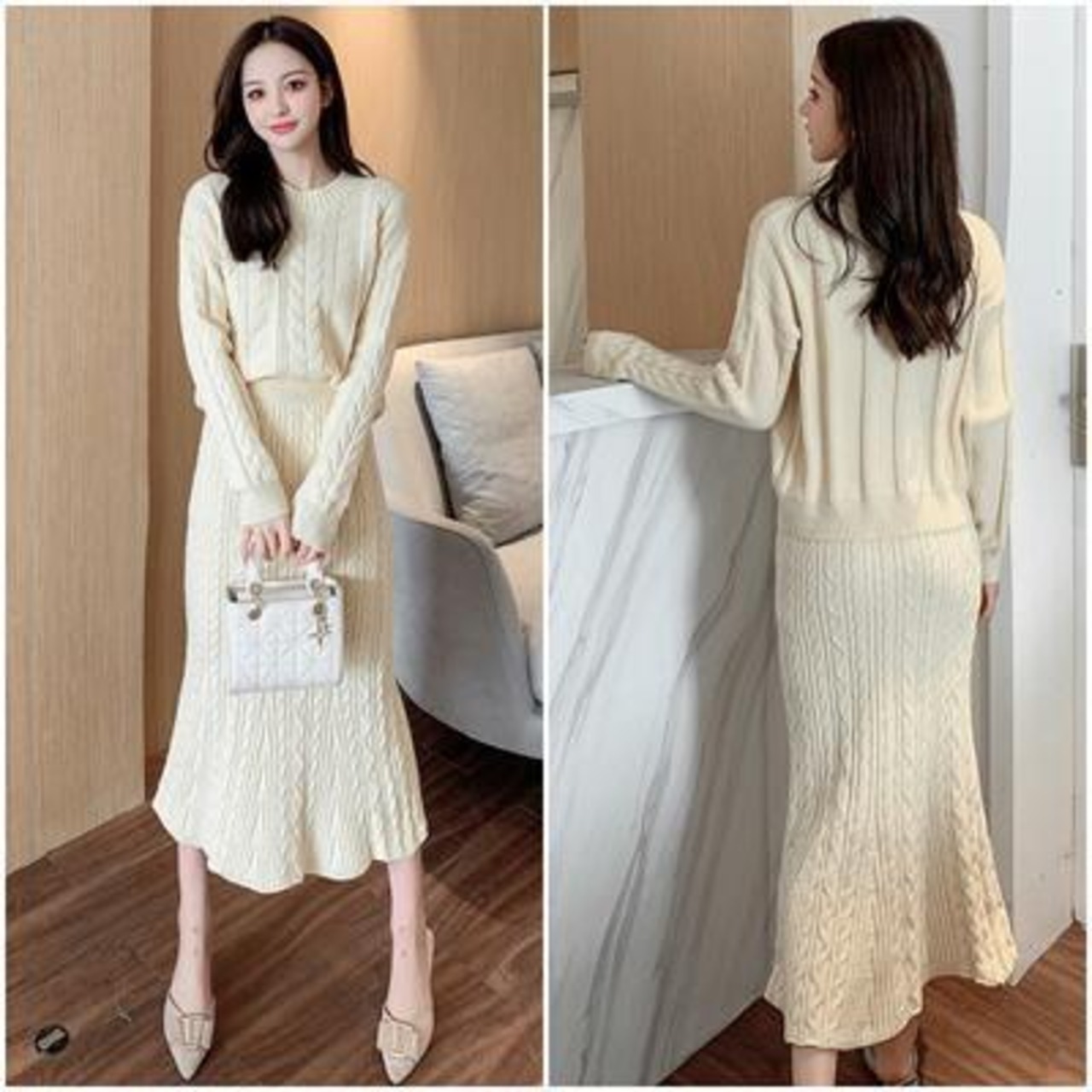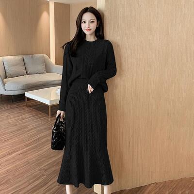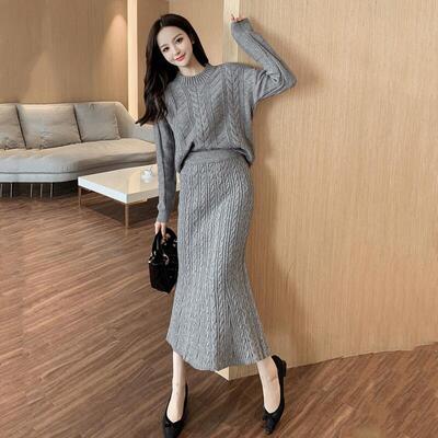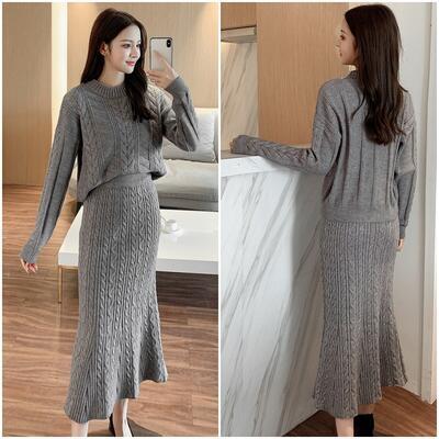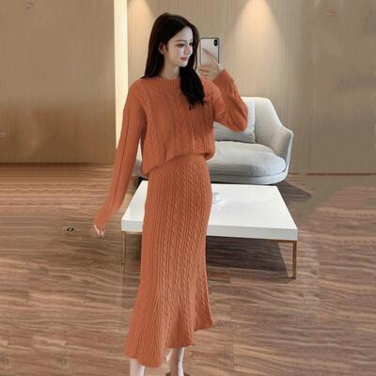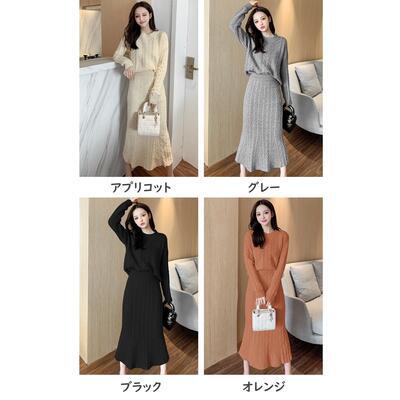 全4色 ツーピース レイヤード セットアップ 2点セット トップス ニット セーター スカート ケーブル編み ミモレ丈 長袖 レディース カジュアル きれいめ おしゃれ シンプル フェミニン 着回し オレンジ グレー ブラック 黒 ベージュ 春 秋 冬 20代 30代 40代 50代
