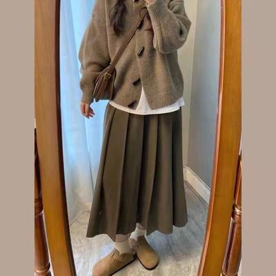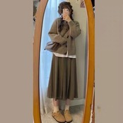 ニットカーディガンとプリーツスカートのセット。