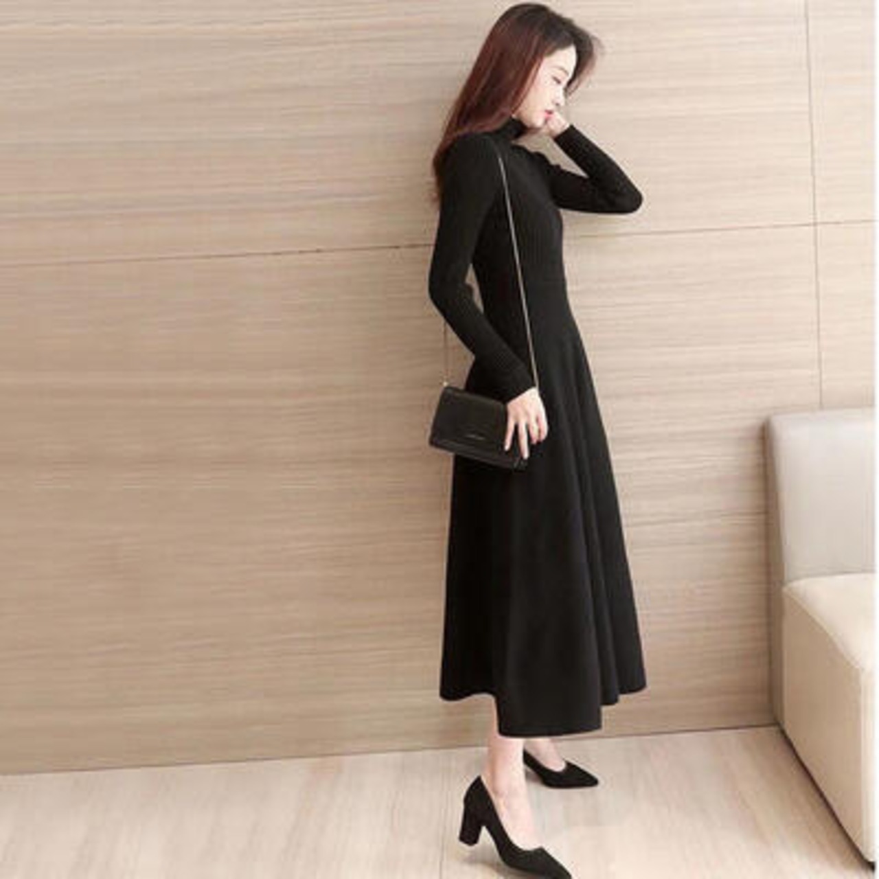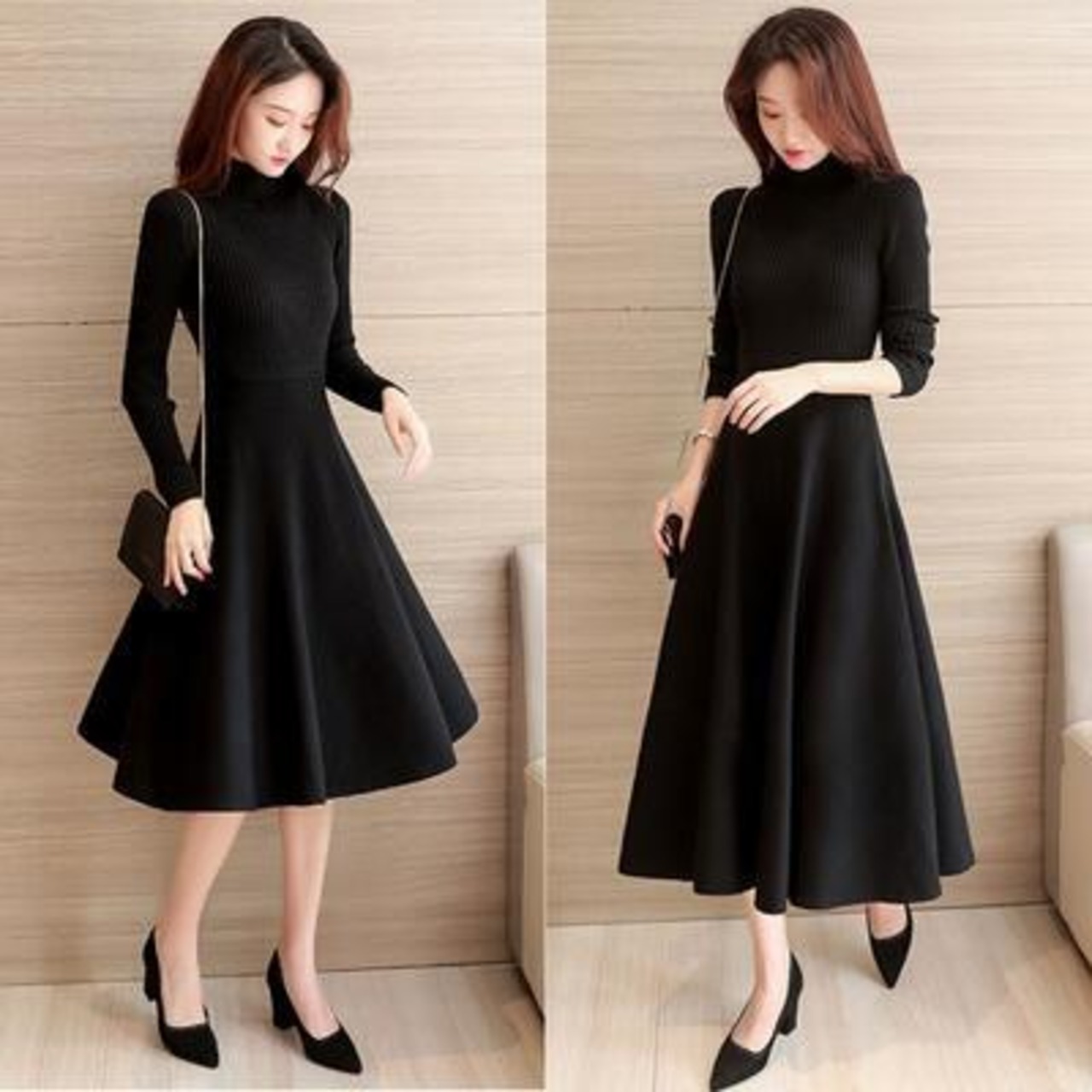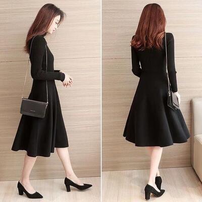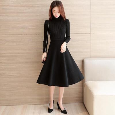 全2種 ワンピース ニット ハイネック きれいめ カジュアル ミモレ丈 ロング丈 ロングワンピ 長袖 おしゃれ レディース ワンピ ドレス 切り替え フレア Aライン 可愛い タートルネック 大きいサイズ フェミニン ブラック 黒 春 秋 冬 20代 30代 40代 50代