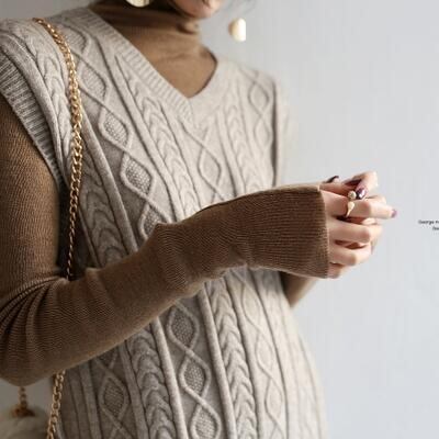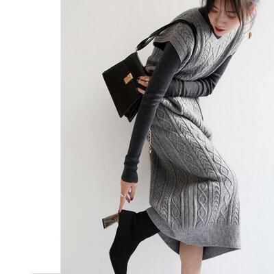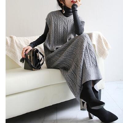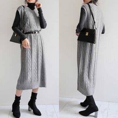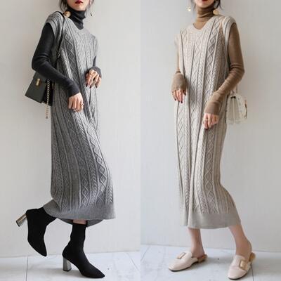 全2色 レイヤード ワンピース ニット ノースリーブ ベスト ケーブル編み きれいめ カジュアル ロング丈 おしゃれ レディース ワンピ ドレス ゆったり 可愛い 重ね着 シンプル 体型カバー フェミニン グレー ベージュ 春 秋 冬 20代 30代 40代 50代