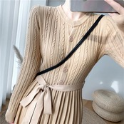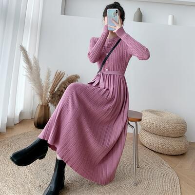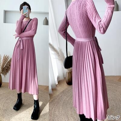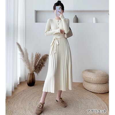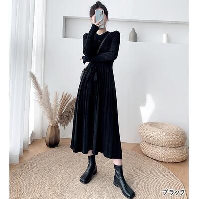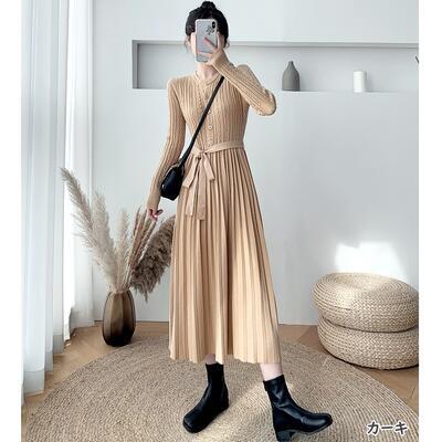 全5色 ニット ワンピース ロングワンピ きれいめ カジュアル ミモレ丈 長袖 ウエストリボン プリーツ おしゃれ レディース ワンピ ドレス フェミニン エレガント Aライン ハイウエスト ブラウン ベージュ カーキ ピンク ブラック 黒 春 秋 冬 20代 30代 40代 50代