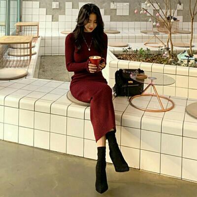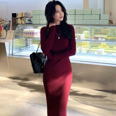 全2種2色 ニット ワンピース ロングワンピ きれいめ カジュアル ミモレ丈 長袖 ハーフネック タイト おしゃれ レディース ワンピ ドレス フェミニン エレガント スリム シンプル ワインレッド ブラック 黒 春 秋 冬 20代 30代 40代 50代