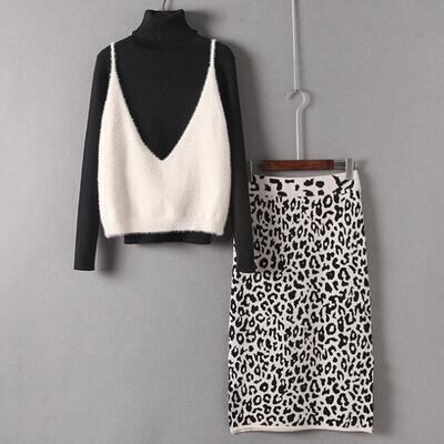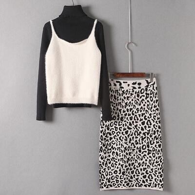 セットアップ 3点セット スーツ ニット セーター スカート タートルネック キャミソール エレガント ミモレ丈 アニマル柄 長袖 レディース カジュアル きれいめ おしゃれ フェミニン ウエストゴム ブラック 黒 春 秋 冬 20代 30代 40代 50代