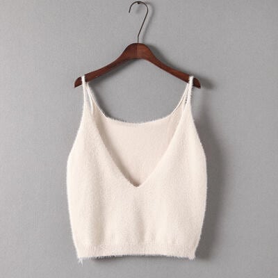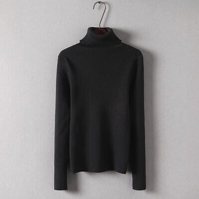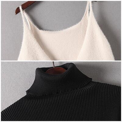 ニットのキャミソール、タートルネックとスカートのセットアップ。