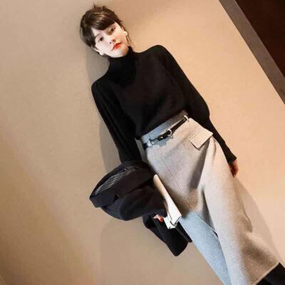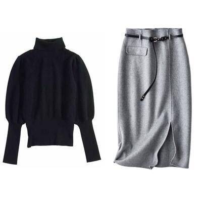 大きいサイズセットアップ 2点セット スーツ ニット セーター スカート タートルネック エレガント ランタンスリーブ 長袖 レディース カジュアル きれいめ おしゃれ フェミニン タイト ミモレ丈 ブラック 黒 グレー 春 秋 冬 20代 30代 40代 50代