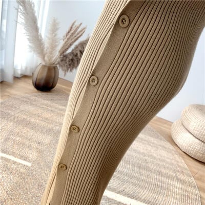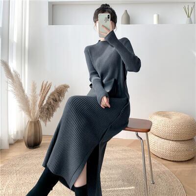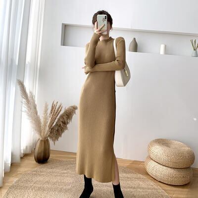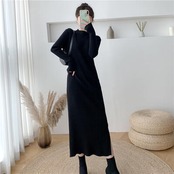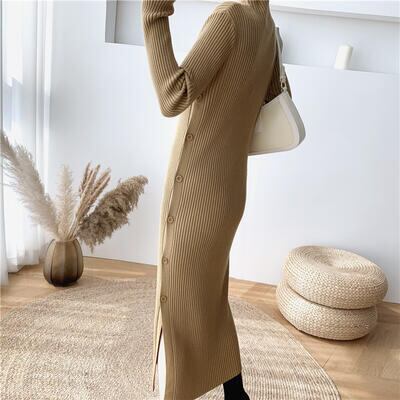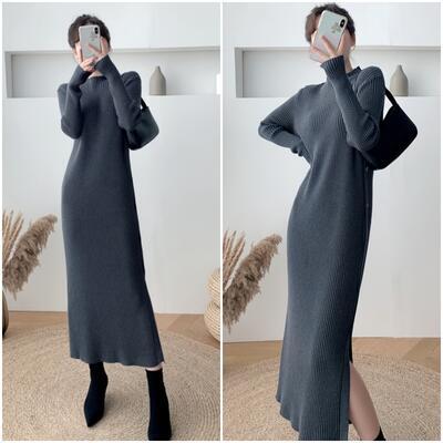 全3色 ニット ワンピース ロングワンピ モックネック きれいめ カジュアル 長袖 ハイネック サイドボタン おしゃれ レディース ワンピ ドレス フェミニン エレガント 大きいサイズ タイト スリム カーキ グレー ブラック 黒 春 秋 冬 20代 30代 40代 50代