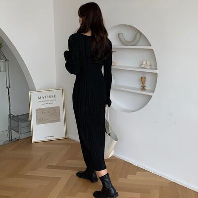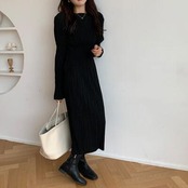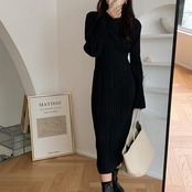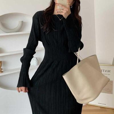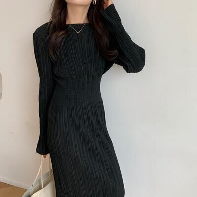ワンピース ロングワンピ プリーツ リンクル ボートネック きれいめ カジュアル 長袖 ミモレ丈 おしゃれ レディース ワンピ ドレス フェミニン エレガント ハイウエスト タイト 大きいサイズ ブラック 黒 春 秋 冬 20代 30代 40代 50代