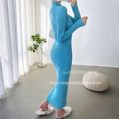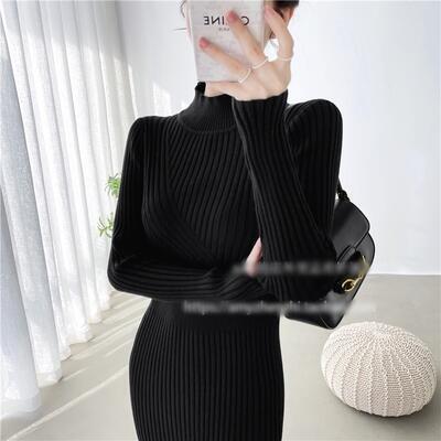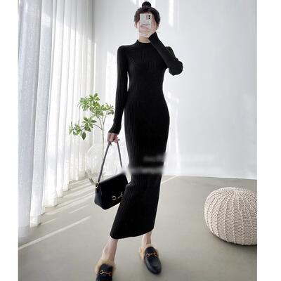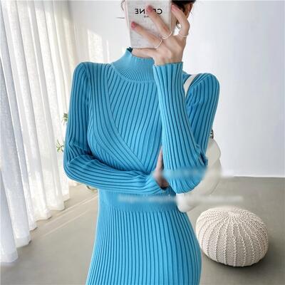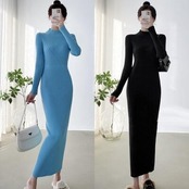 全2色 タイト スレンダーニット ワンピース ロングワンピ ハイネック きれいめ カジュアル 長袖 ロング丈 切り替え おしゃれ レディース ワンピ ドレス フェミニン エレガント ハイウエスト シンプル ハーフネック ブルー 青 ブラック 黒 春 秋 冬 20代 30代 40代 50代