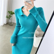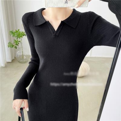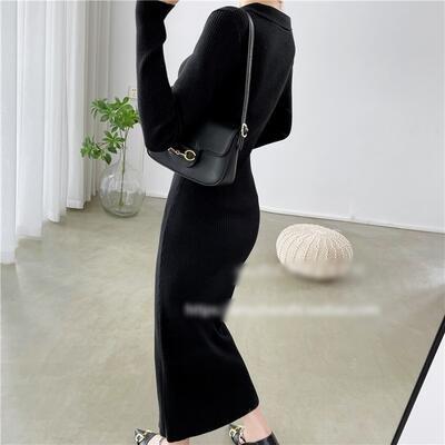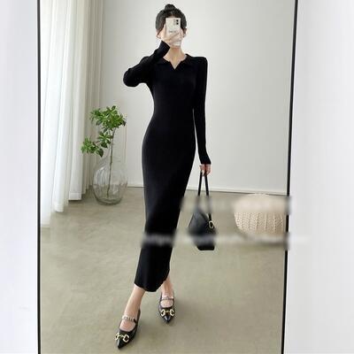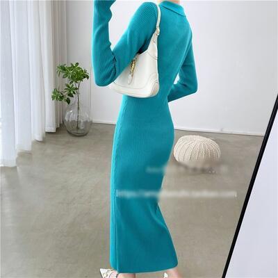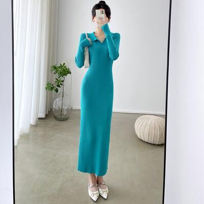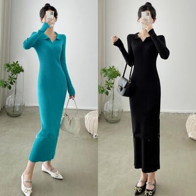 全2色 ニット ワンピース ロングワンピ 開襟 きれいめ カジュアル 長袖 キーネック ミモレ丈 おしゃれ レディース ワンピ ドレス フェミニン エレガント タイト スリム ブルー 青 ブラック 黒 春 秋 冬 20代 30代 40代 50代