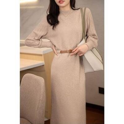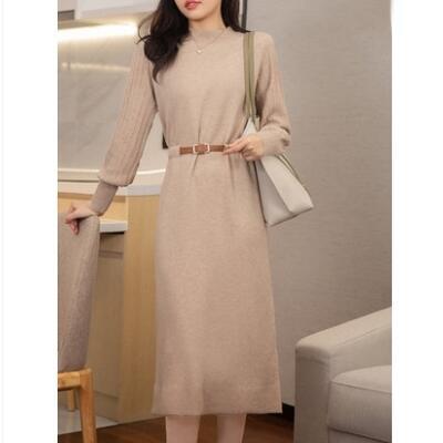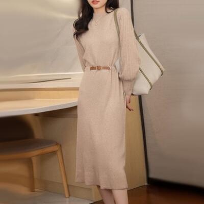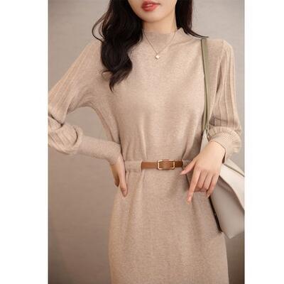 ニット ワンピース ロングワンピ きれいめ カジュアル 長袖 ミモレ丈 おしゃれ レディース ワンピ ドレス フェミニン エレガント ウエストベルト ハイウエスト ハイネック パフスリーブ 大きいサイズ カーキ 春 秋 冬 20代 30代 40代 50代