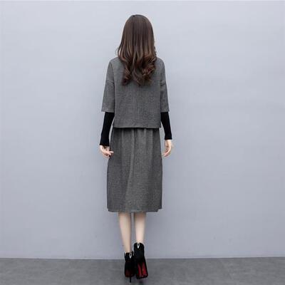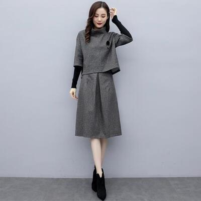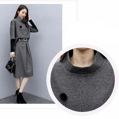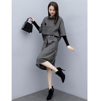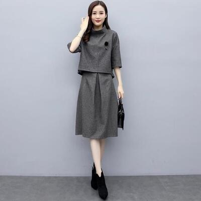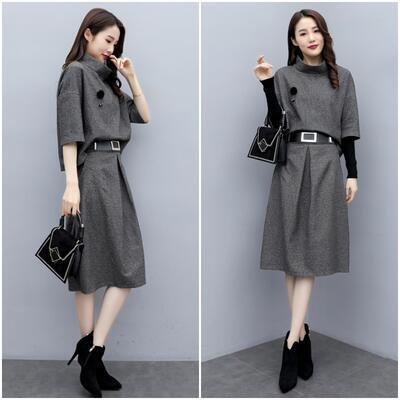 セットアップ 2点セット スーツ トップス スカート ハイネック エレガント 五分袖 レディース カジュアル きれいめ おしゃれ モックネック ひざ丈 通勤 お出かけ ウエストゴム ベルト 大きいサイズ グレー 春 秋 冬 20代 30代 40代 50代