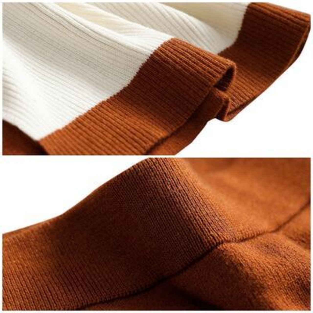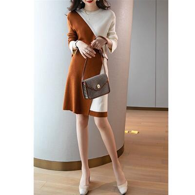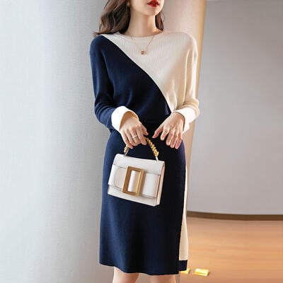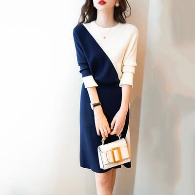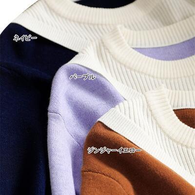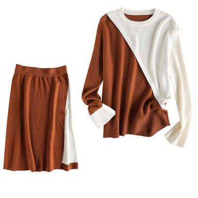 全3色 大きいサイズセットアップ 2点セット ニット トップス セーター スカート ひざ丈 配色 エレガント 長袖 レディース カジュアル きれいめ おしゃれ バイカラー ウエストゴム フェミニン パープル ネイビー ブラウン 春 秋 冬 20代 30代 40代 50代