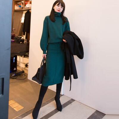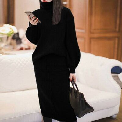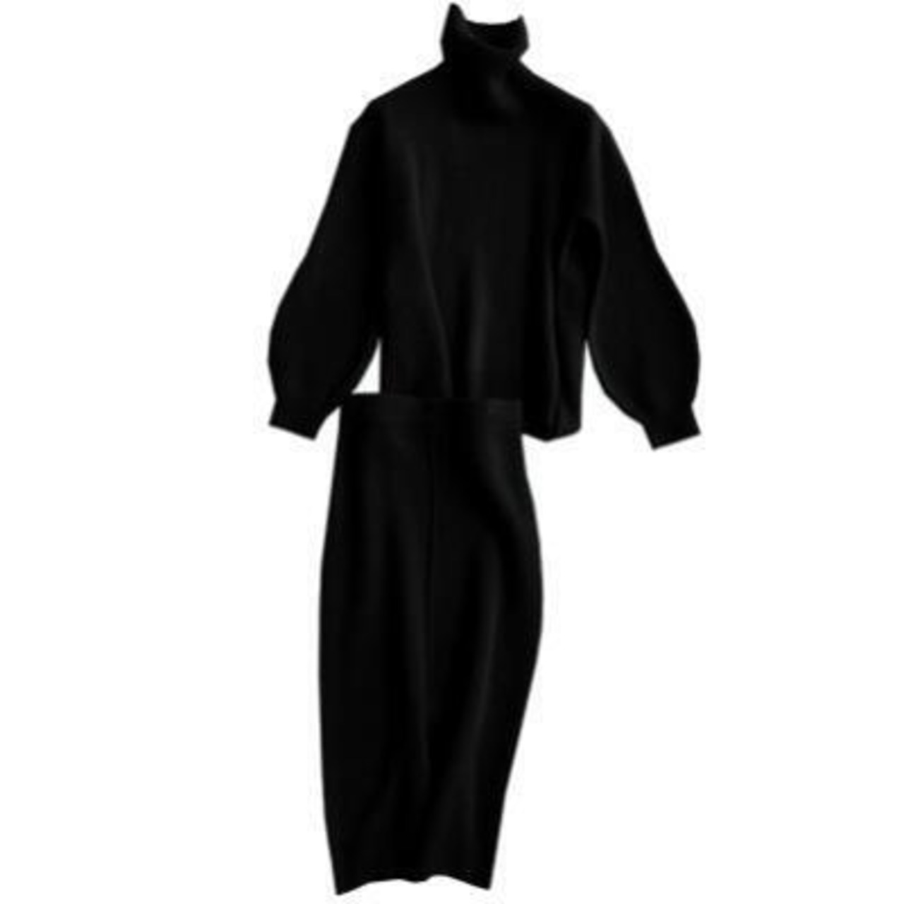 ニットのパフスリーブタートルトップス&スカートのセットアップ。