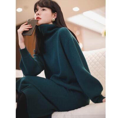 全3色 セットアップ 2点セット ニット トップス セーター タートルネック スカート ミモレ丈 エレガント 長袖 レディース カジュアル きれいめ おしゃれ シンプル フェミニン グリーン 緑 ブラック 黒 レッド 赤 春 秋 冬 20代 30代 40代 50代