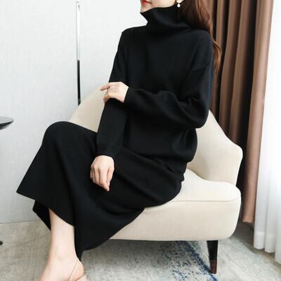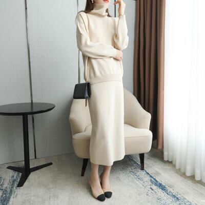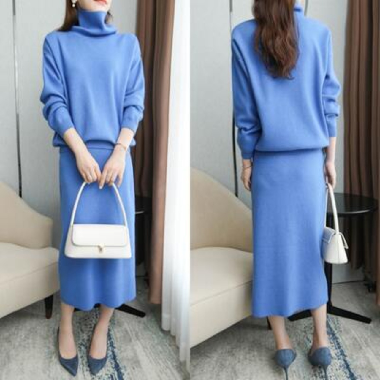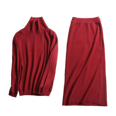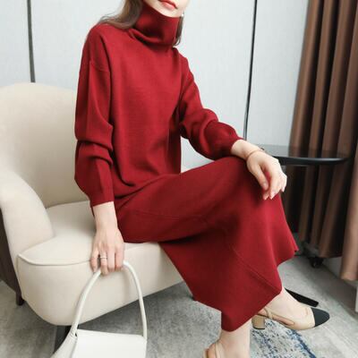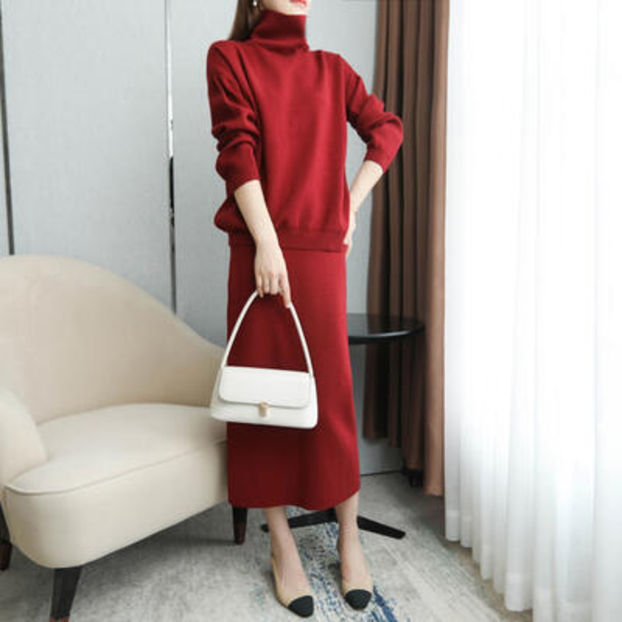 全4色 大きいサイズセットアップ 2点セット トップス セーター タートルネック スカート ミモレ丈 エレガント レディース カジュアル きれいめ おしゃれ シンプル ウエストゴム フェミニン レッド 赤 ブラック 黒 ブルー 青 ベージュ 春 秋 冬 20代 30代 40代 50代