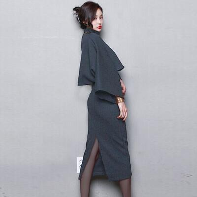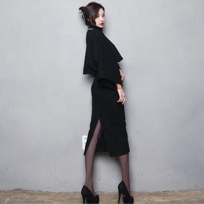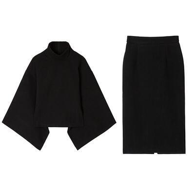 ショート丈のタートルネックトップス&スカートのセットアップ。