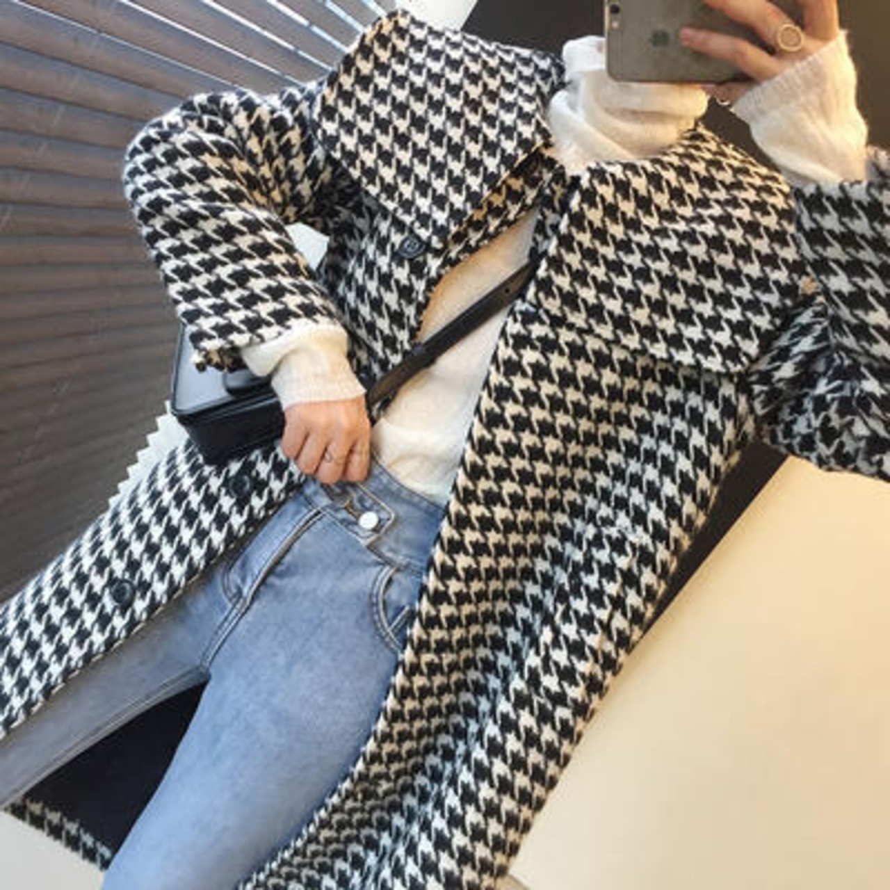 大きいサイズ ステンカラーコート チェスター レディース きれいめ エレガント ジャケット アウター ロング丈 コート 千鳥格子 おしゃれ 長袖 セーラーカラー ビッグカラー 大人可愛い ゆったり フェミニン 体型カバー ブラック 黒 春 秋 冬 20代 30代 40代 50代