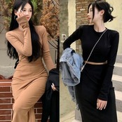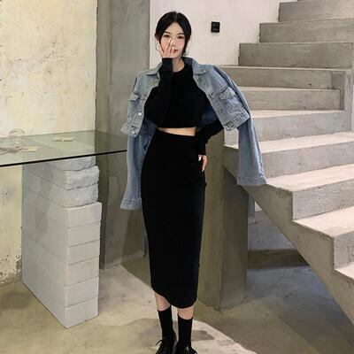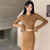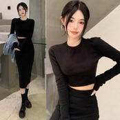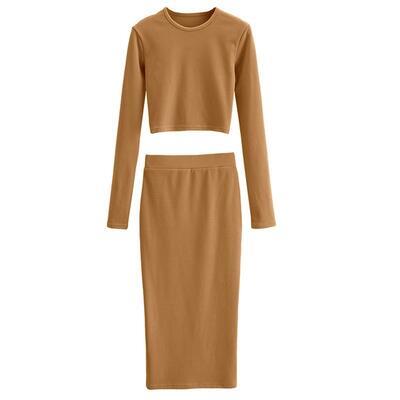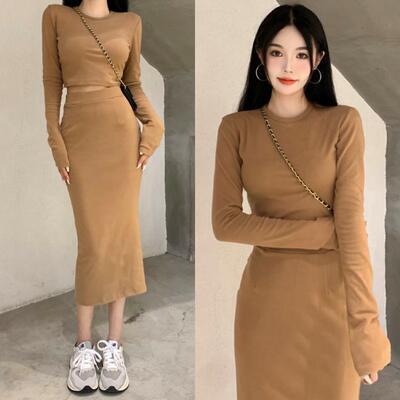 全2色 セットアップ 2点セット Tシャツ カットソー トップス スカート ショート丈 ミモレ丈 エレガント レディース カジュアル きれいめ 可愛い おしゃれ シンプル フェミニン タイト 大きいサイズ ブラック 黒 カーキ 春 秋 冬 20代 30代 40代 50代