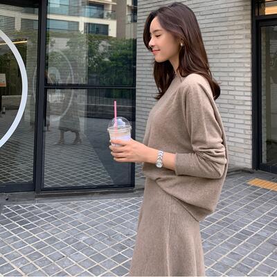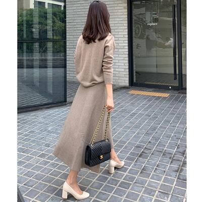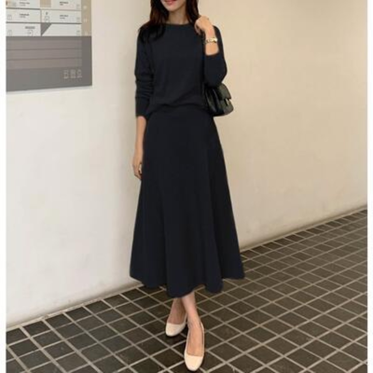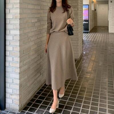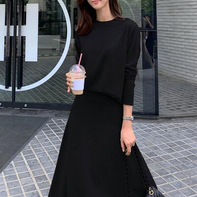 シンプルなニットトップス&フレアスカートのセットアップ。