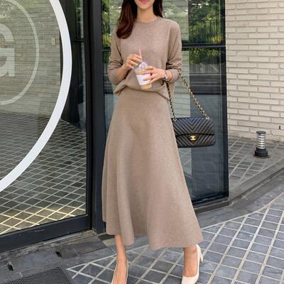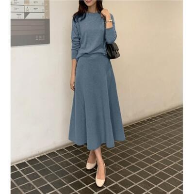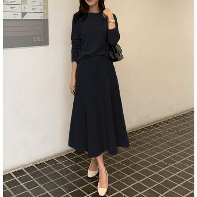 全3色 セットアップ 2点セット ニット トップス セーター スカート ミモレ丈 フレア エレガント レディース カジュアル きれいめ 可愛い おしゃれ プルオーバー ウエストゴム シンプル フェミニン ベージュ ブラック 黒 ブルー 青 春 秋 冬 20代 30代 40代 50代