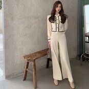 コンパクトなトップスにハイウエストのパンツがスタイルアップをアシスト。