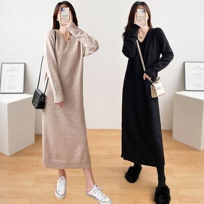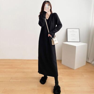 全2色 ニット ワンピース ロングワンピ きれいめ カジュアル ミモレ丈 長袖 Vネック ワンピ レディース ドレス ゆったり リラックス シンプル 大人可愛い フェミニン 大きいサイズ ブラック 黒 ベージュ 春 秋 冬 20代 30代 40代 50代