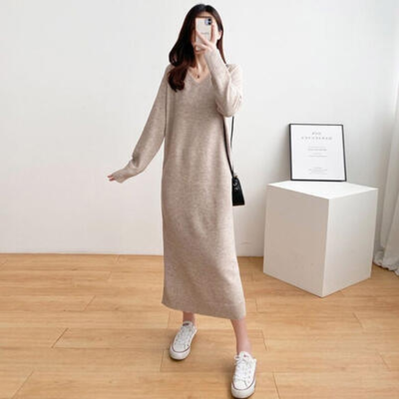 ストンとしたシルエットのVでネックニットワンピース。
