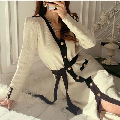 エレガントな雰囲気漂うバイカラーのニットワンピース。
