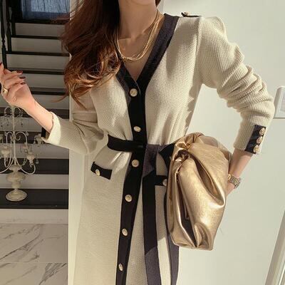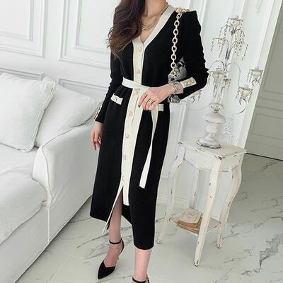 全2色 ニット ワンピース ロングワンピ カーディガン きれいめ カジュアル バイカラー ミモレ丈 長袖 ワンピ レディース ドレス 羽織り 配色 ウエストベルト エレガント 大きいサイズ 大人可愛い フェミニン ベージュ ブラック 春 秋 冬 20代 30代 40代 50代