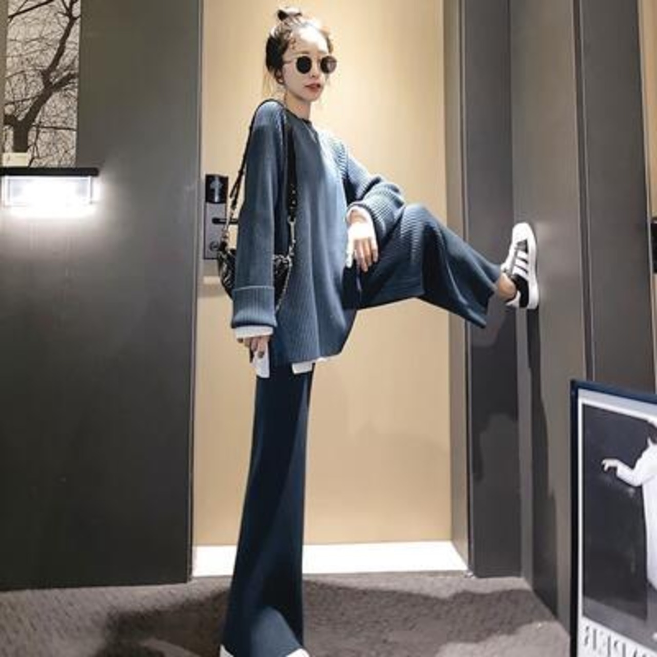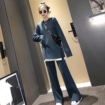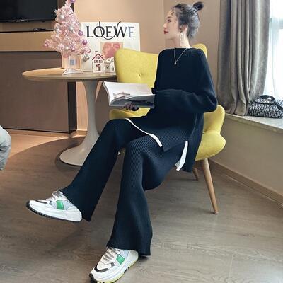 ニットのトップス&パンツのセットアップ。