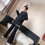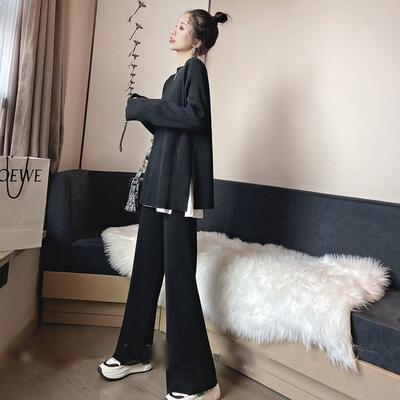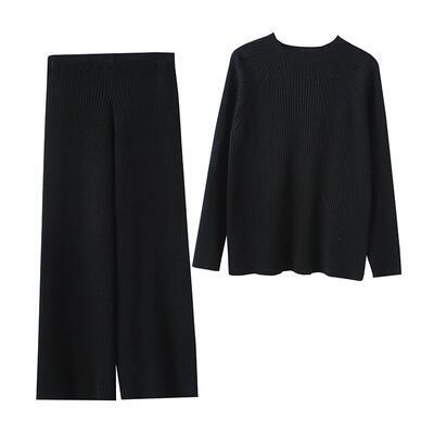 全2色 セットアップ 2点セット ニット トップス パンツ カットソー 長袖 レディース カジュアル きれいめ 可愛い おしゃれ ワイドレッグ ロングパンツ 着回し シンプル プルオーバー リラックス フェミニン ブラック 黒 グレー 春 秋 冬 20代 30代 40代 50代