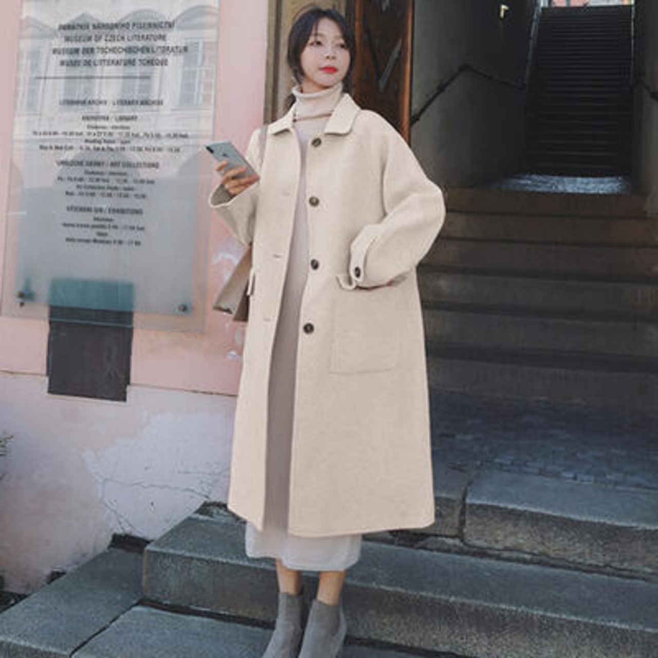 ナチュラルカラーが大人可愛いステンカラーコート。