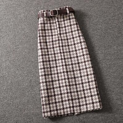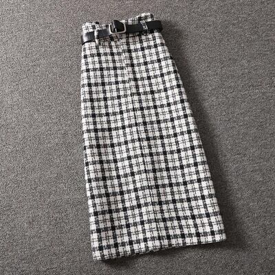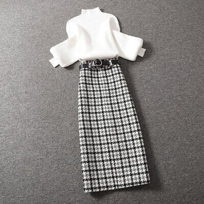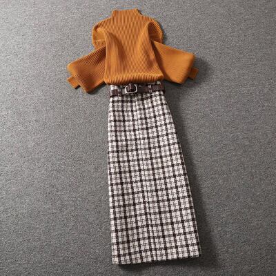 全2色 セットアップ 2点セット トップス ハイネック ランタンスリーブ スカート チェック柄 長袖 ミモレ丈 レディース カジュアル きれいめ 可愛い エレガント おしゃれ タイト フェミニン ホワイト 白 ブラック 黒 カーキ 春 秋 冬 20代 30代 40代 50代