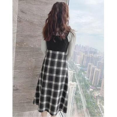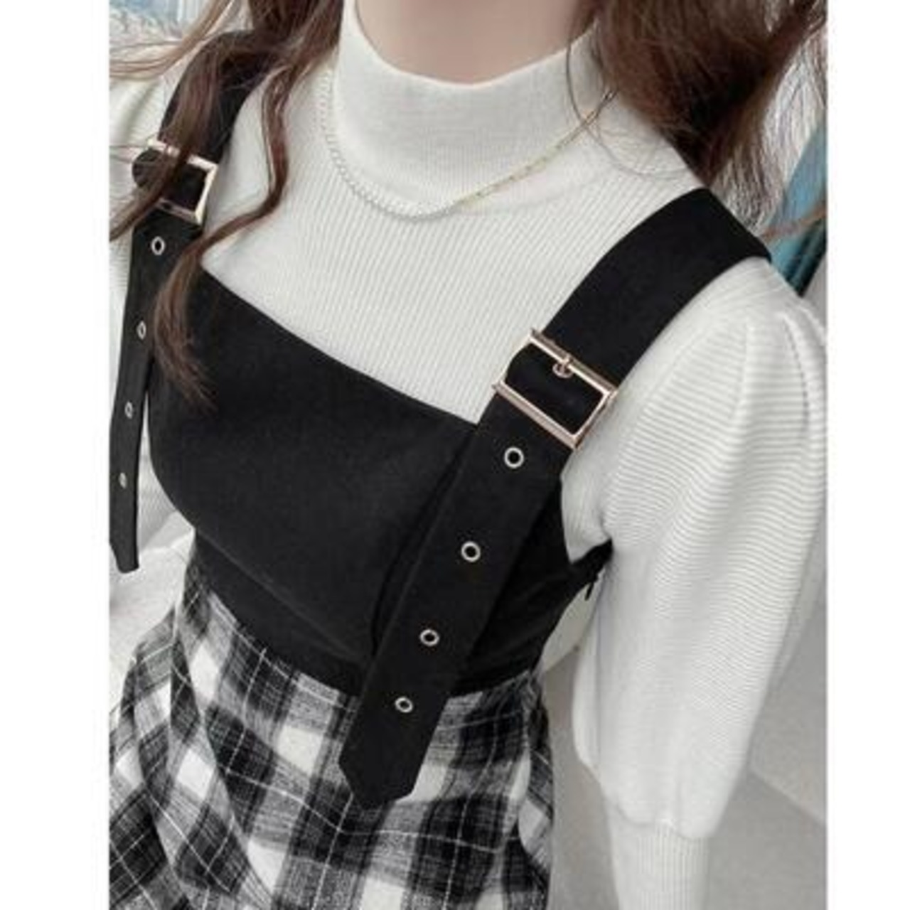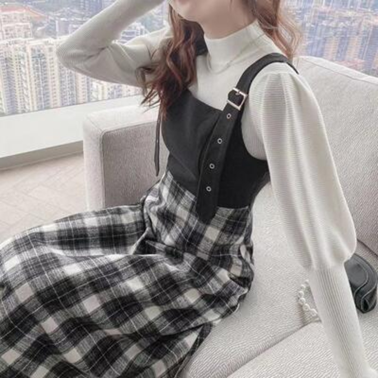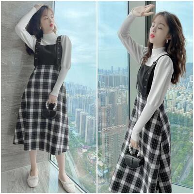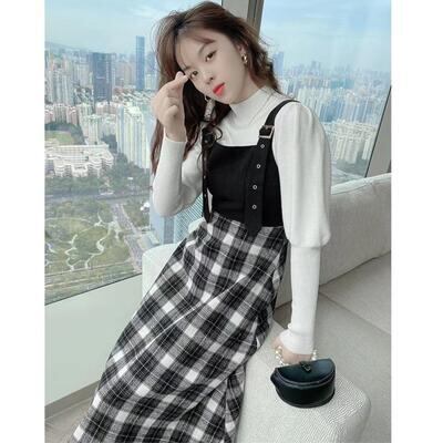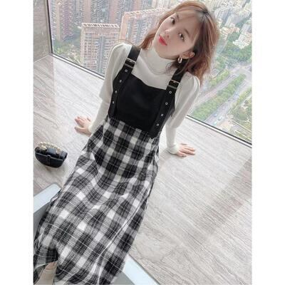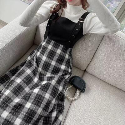 チェック柄のジャンパースカートとハイネックニットのセット。