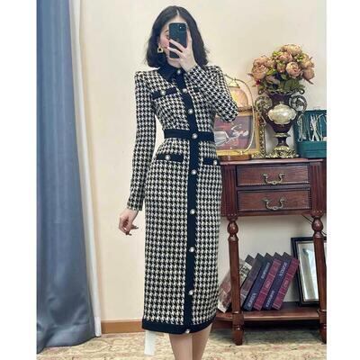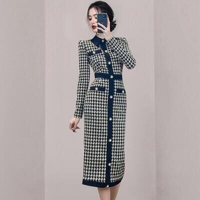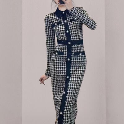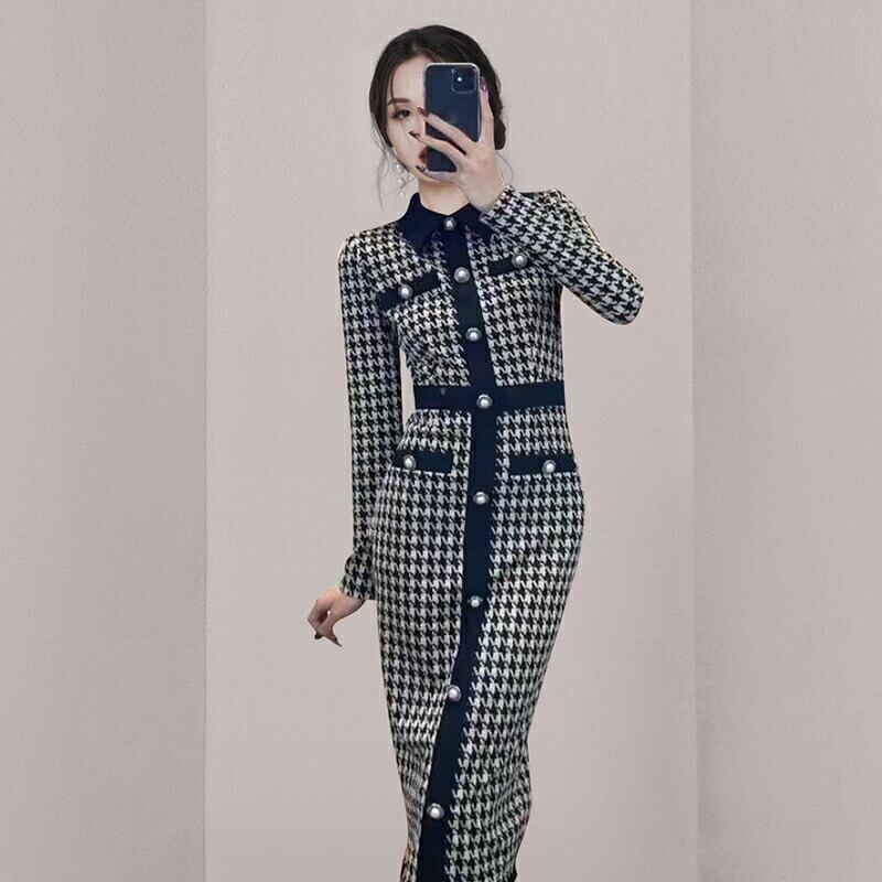 ワンピース ニット ロングワンピ 千鳥格子柄 エレガント カジュアル ミモレ丈 長袖 ワンピ レディース ドレス タイト スリム 大人可愛い 上品 おしゃれ ハイウエスト フェミニン ブラック 春 秋 冬 20代 30代 40代 50代