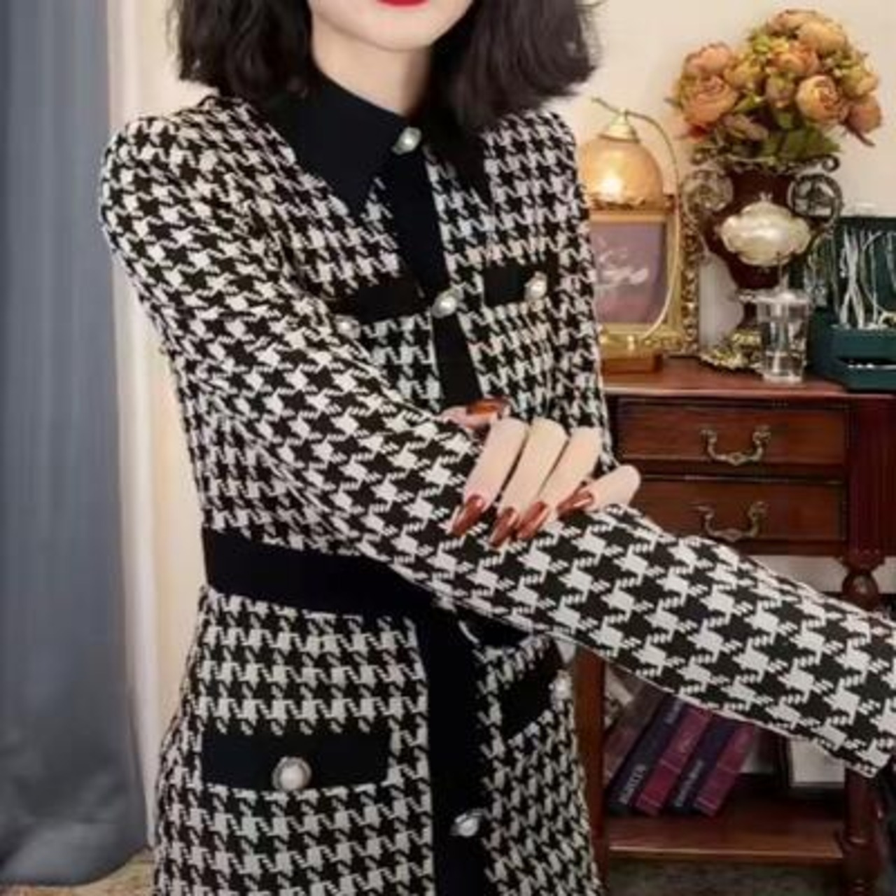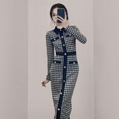 千鳥格子柄のフェミニンなニットワンピース。