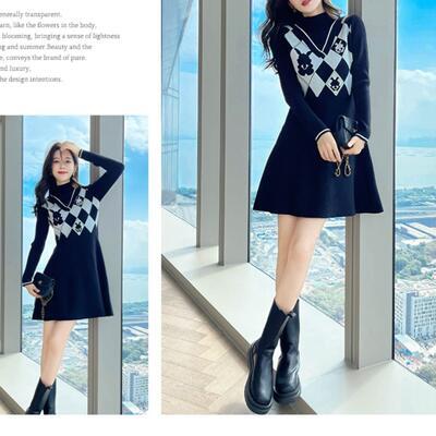 ダイヤ柄が大人可愛いハイネックニットワンピース。