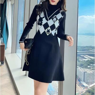 ニット ワンピース ショートワンピ ハイネック エレガント カジュアル ミニ丈 長袖 レディース ワンピ ドレス シンプル Aライン フェミニン ハイウエスト フレアスカート 大人可愛い 大きいサイズ ブラック 黒 春 秋 冬 20代 30代 40代 50代
