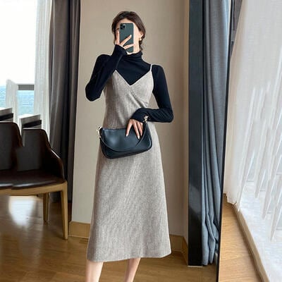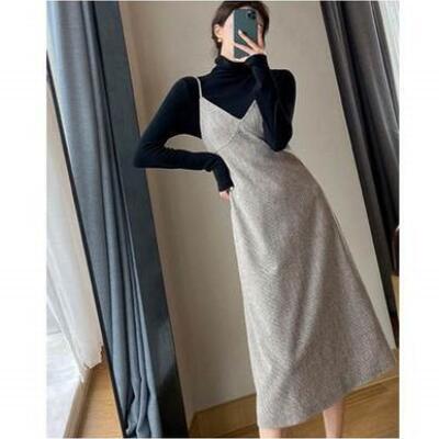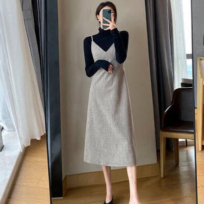 大きいサイズセットアップ 2点セット ニット ワンピース ロングワンピ タートルネック カジュアル ミモレ丈 長袖 レディース ワンピ ドレス サロペットスカート ジャンパースカート フェミニン シンプル 大人可愛い ベージュ ブラック 黒 春 秋 冬 20代 30代 40代 50代