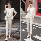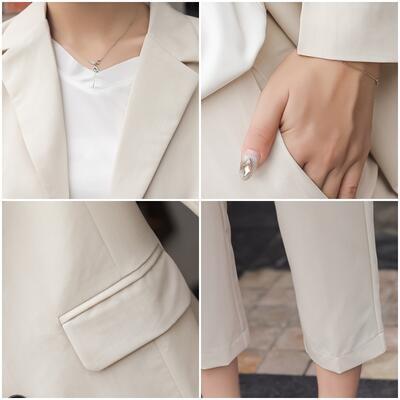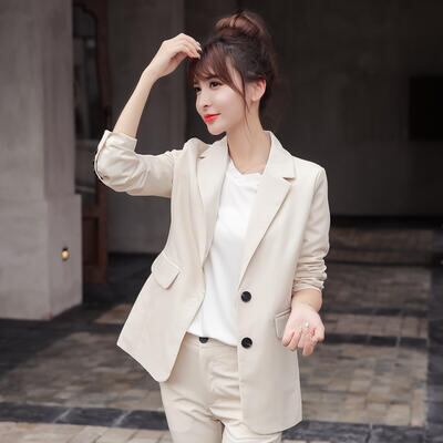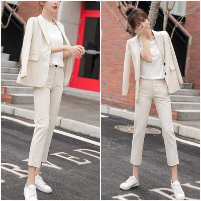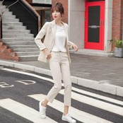 ナチュラルカラーのテーラードジャケット&パンツのスーツ。