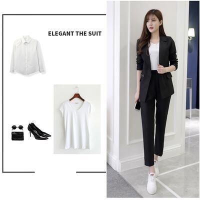 テーラードジャケット&パンツのスーツとインナーTシャツの3点セット。