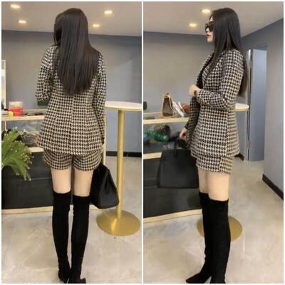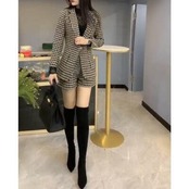 千鳥格子柄のジャケット&ショートパンツのセットアップ。