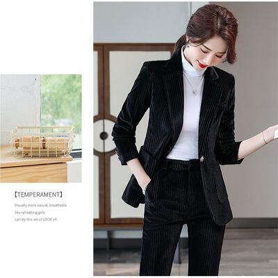 上品クラシカルな印象のベルベットジャケット&パンツのスーツ。